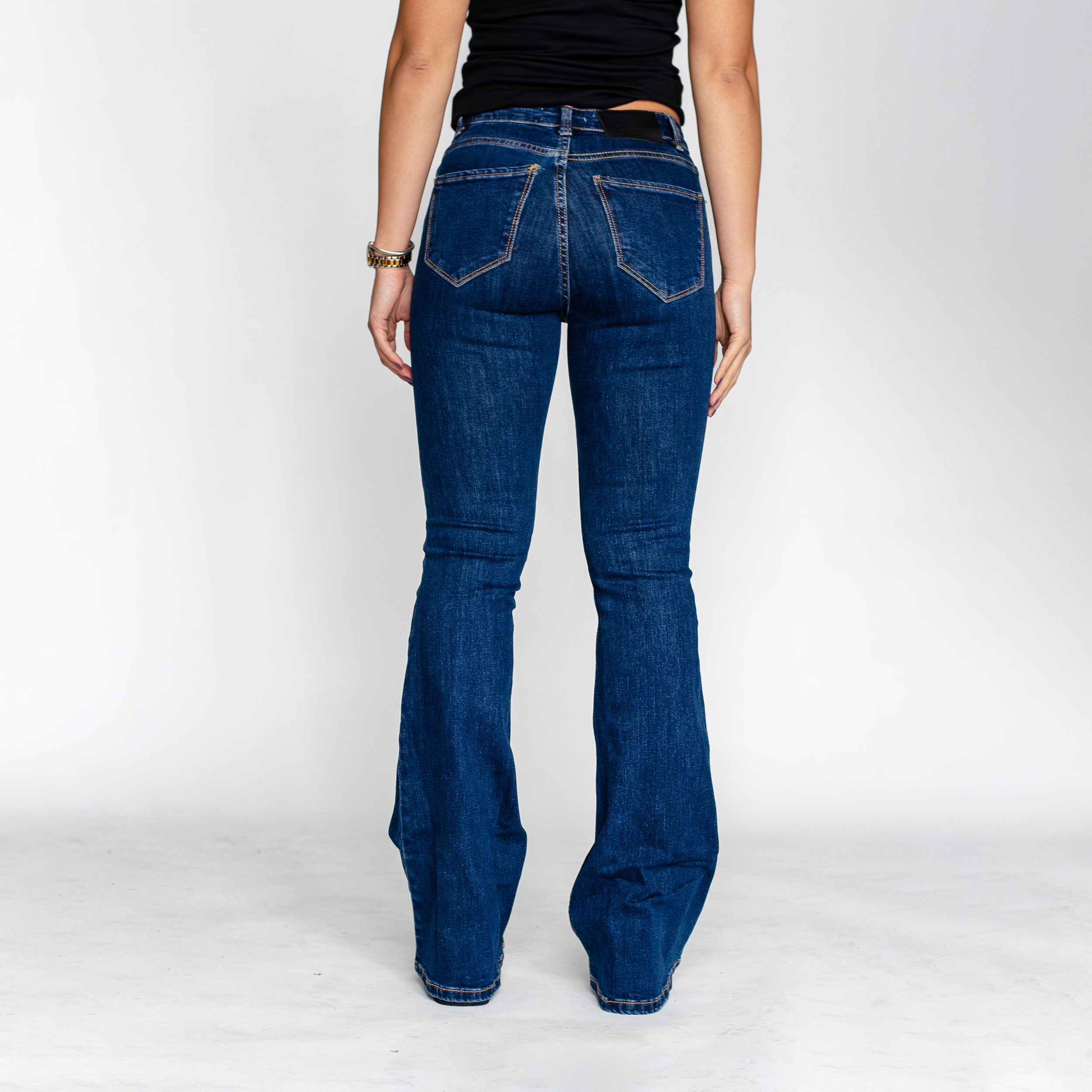 Channel a retro-inspired look with these dark blue high-waisted flare jeans. The flattering high-rise and iconic flare leg create a balanced silhouette that is both stylish and comfortable. Made from a rich, dark wash denim with plenty of stretch, these jeans are perfect for elongating your legs and adding a vintage flair to any outfit.